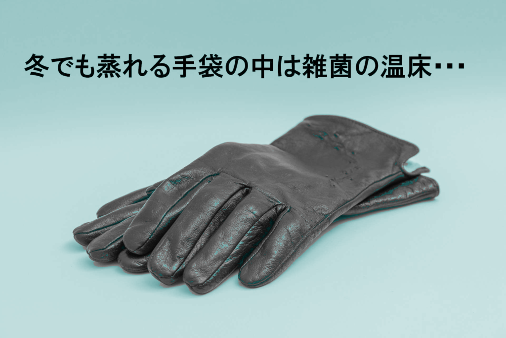 それに手袋を外した手は、プーンと悪臭が漂います。手の体温で温かく、手汗で蒸れやすい手袋は冬でも雑菌が繁殖しい環境。特に何気なくモノを触った後に手袋をはめると、それだけで雑菌やウィルスが大繁殖。