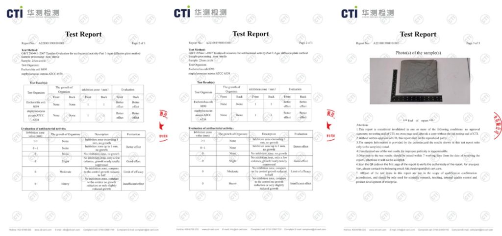 ™SLVRTEC™”の抗菌作用は、国際的な化学検査機関で、中国をはじめ欧米でも認証検査機関として指定を受けるCTI(華測検測)にて抗菌検査を実施。細菌類の繁殖を抑えることを実証しています。